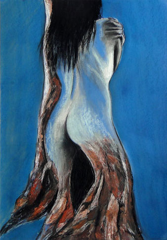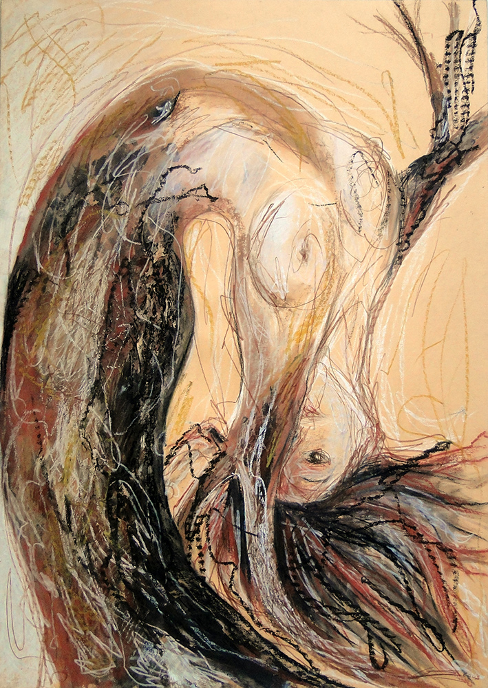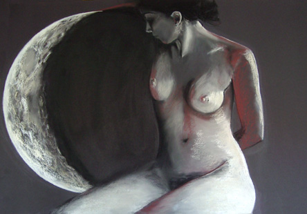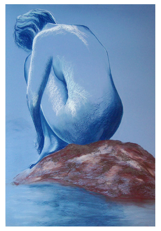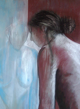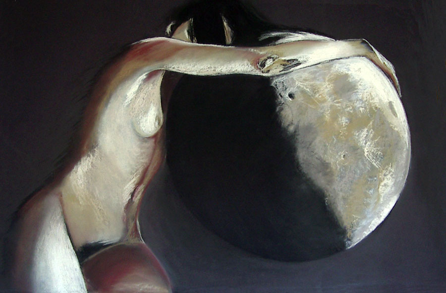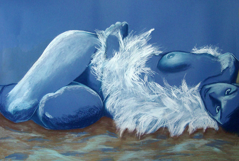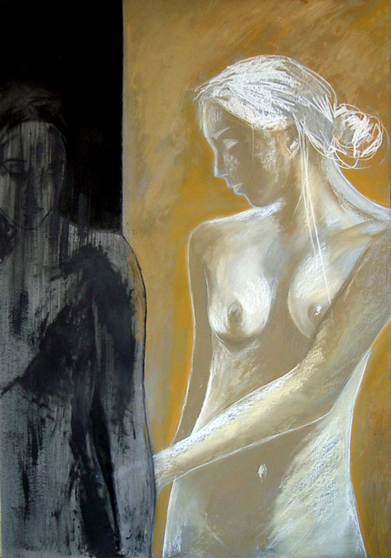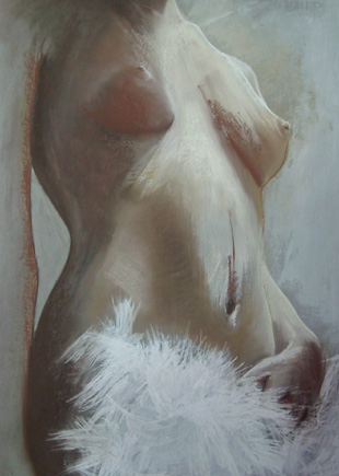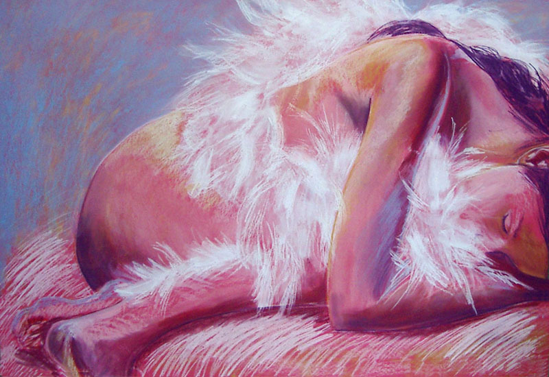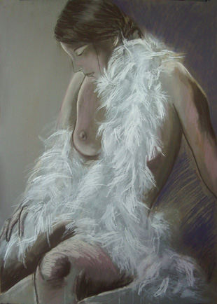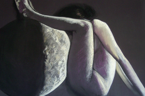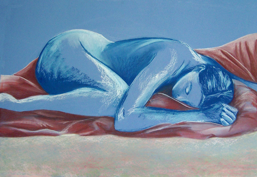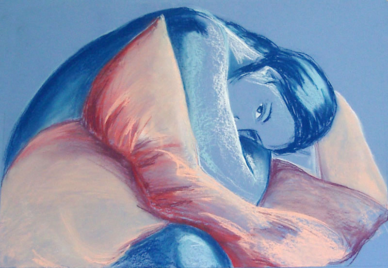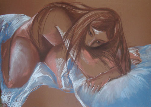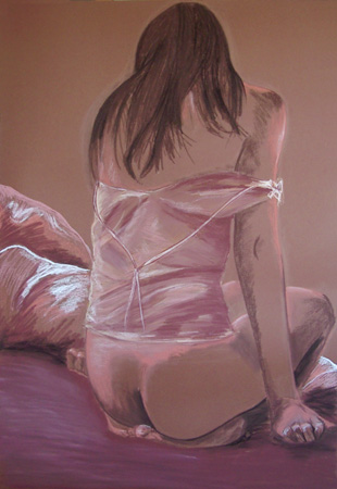 Dans cette série de tableaux de nus, je cherche à transmettre l'état d'esprit et les émotions du modèle, à travers les postures de son corps. Je travaille avec le pastel en l'estompant pour donner un côté velouté et par traits énergiques pour créer un contraste entre force et douceur.
